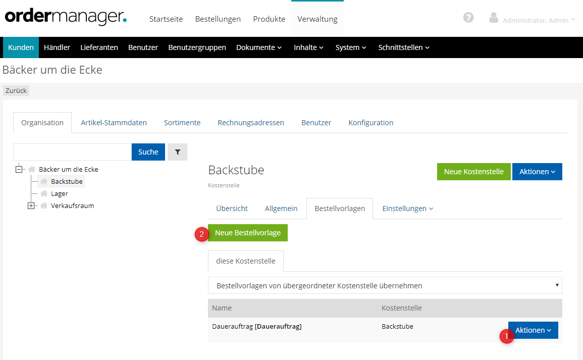 Der Aufruf erfolgt über: Verwaltung | Kunden | Organisation | Bestellvorlagen