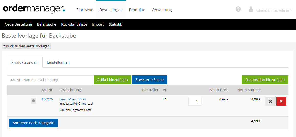 Dies ist sozusagen der Warenkorb des Dauerauftrags. Sie können die Bestellmengen ändern und sofern Sie die Rechte dazu besitzen Preise einsehen und den Lagerbestand prüfen.