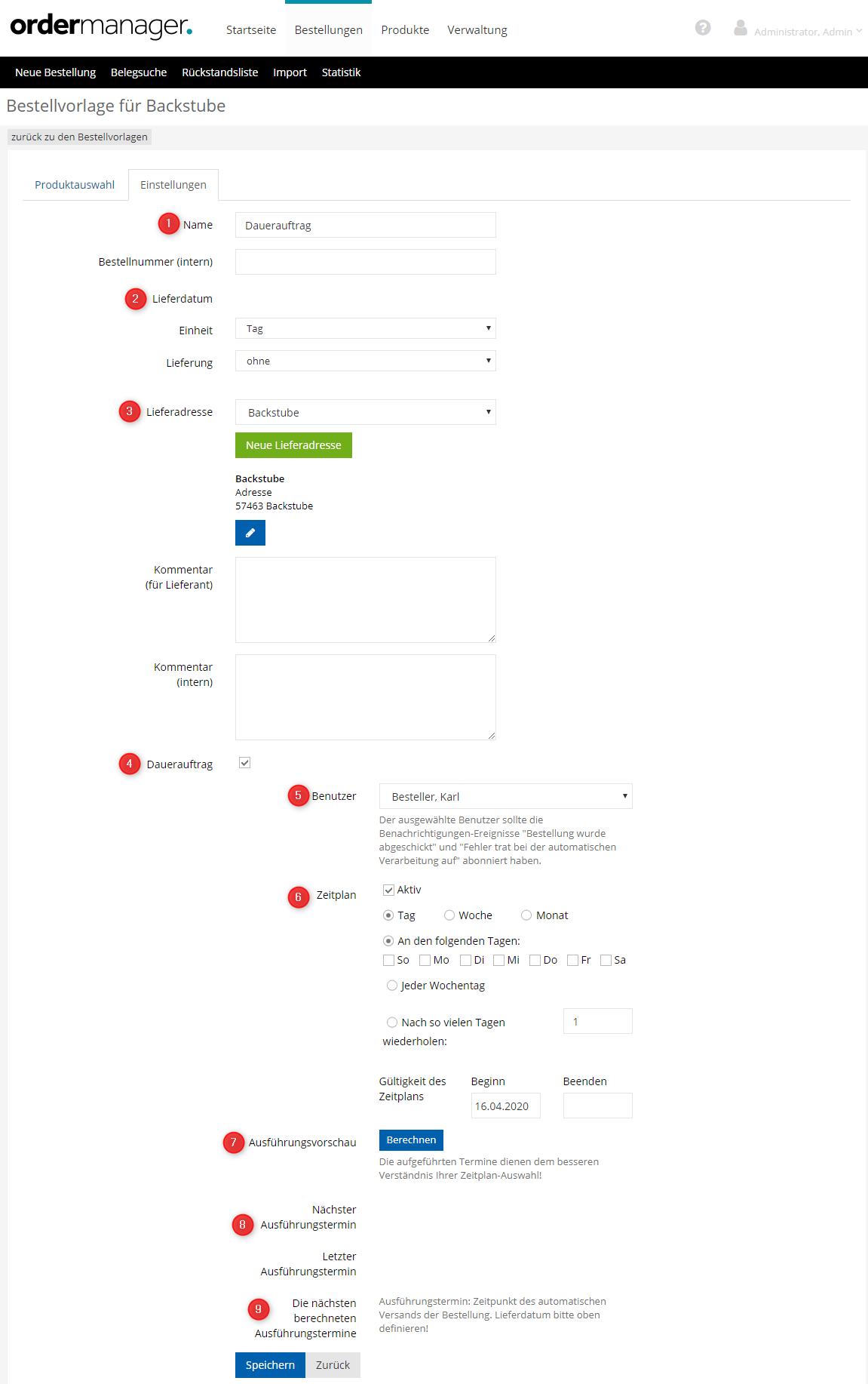5 | Benutzer | Der hinterlegte Benutzer ist als Ansprechpartner des Dauerauftrags zu sehen. Er sollte die Benachrichtigungen "Bestellung wurde abgeschickt" und "Fehler trat bei der automatischen Verarbeitung auf" abonniert haben. |