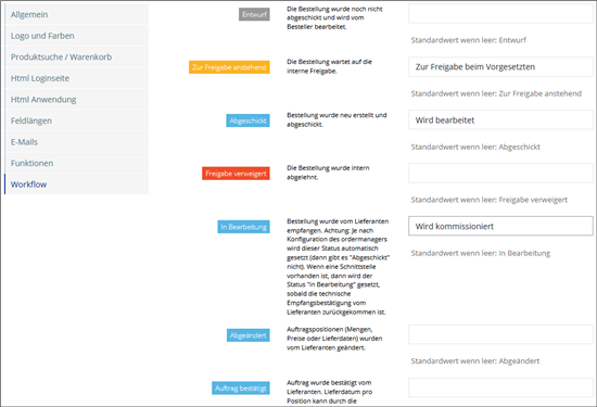 Ab sofort können Sie die Statustexte im ordermanager an Ihre individuellen Prozesse anpassen. Die Einstellungen gelten systemweit. Sie finden die Einstellung als Systemadmin unter System → Grundeinstellungen → Workflow