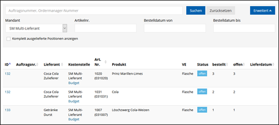 Layout der Rückstandsliste wurde verbessert und die erweiterten Suchoptionen verstecken sich in dem Bereich "Erweitert". Zusätzliche Spalten "Lieferant" und "Lieferantenartikelnummer" (nur im supplymanager).