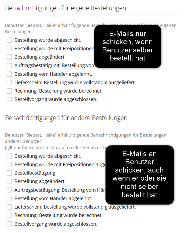 Wir haben die Anzahl der Benachrichtigungen verdoppelt! Jetzt kann pro Benachrichtigung entschieden werden, ob nur der Besteller informiert werden soll oder ob alle Benutzer informiert werden sollen, die Zugriff auf die Kostenstelle haben.