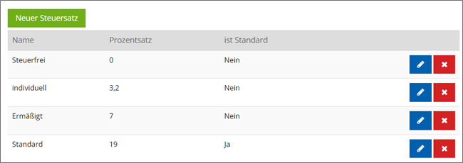 In den Grundeinstellungen können die Steuersätze nachträglich angepasst werden. Alle mit dem Steuersatz verknüpften Produkte übernehmen den Steuersatz automatisch.
