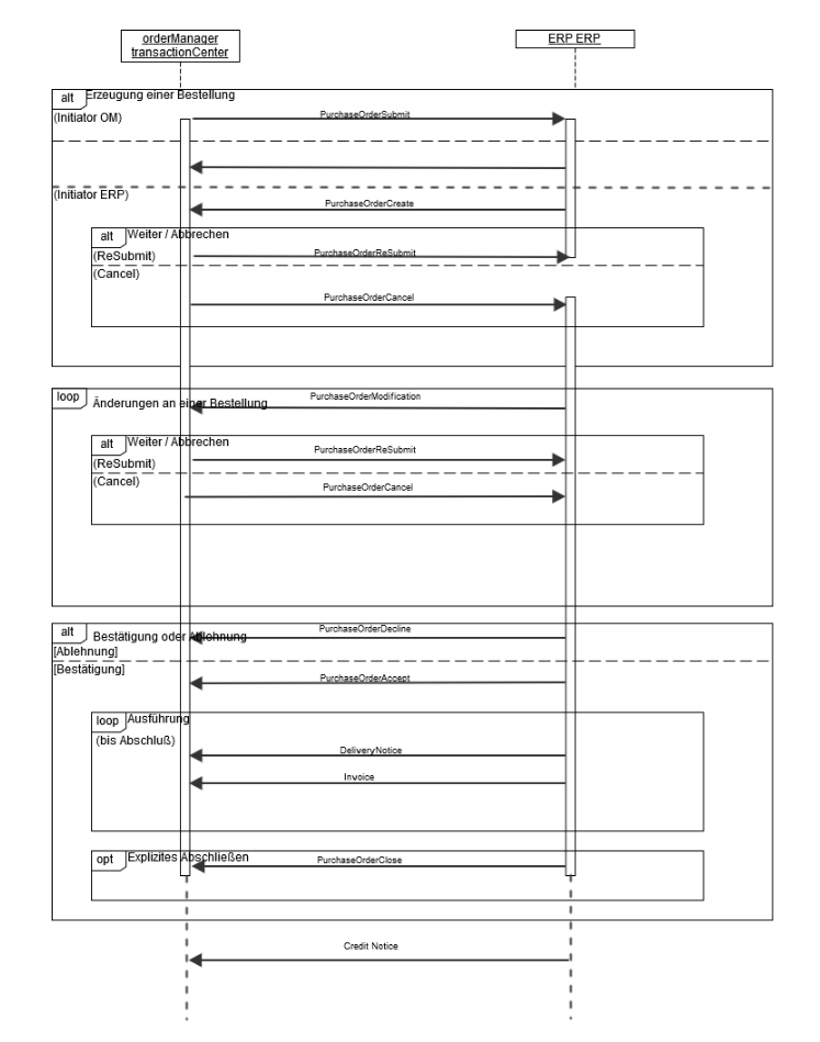 - Wenn sich von Seiten des Händlers Änderungen an einem Auftrag ergeben, dann wird die gesamte geänderte Bestellung von der Warenwirtschaft in einer „PurchaseOrderModification"Nachricht an ordermanager übermittelt. Innerhalb von ordermanager durchläuft die geänderte Bestellung nochmals den gesamt Prüf und Freigabeprozess (wegen der möglichen Budgetwirksamkeit von Änderungen am Auftrag) und wird nach ihrer Freigabe wieder vollständig in einer „PurchaseOrderReSubmit"-Nachricht an die Warenwirtschaft mitgeteilt. Diese Folge der beiden letzten Nachrichten kann mehrmals wiederholt werden. Nachdem die „PurchaseOrderModification"-Nachricht an den ordermanager gesendet wurde, darf der Auftrag in der Warenwirtschaft nicht weiter bearbeitet werden. Erst nach dem eintreffen der „PurchaseOrderReSubmit"-Nachricht sollte der Auftrag weiter bearbeitet werden.